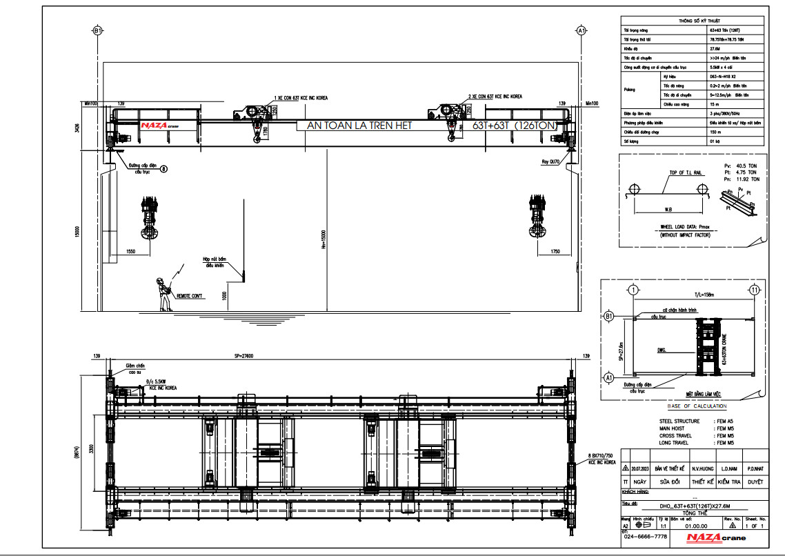 – Thông số kỹ thuật cầu trục 63+63 tấn cụ thể như sau: